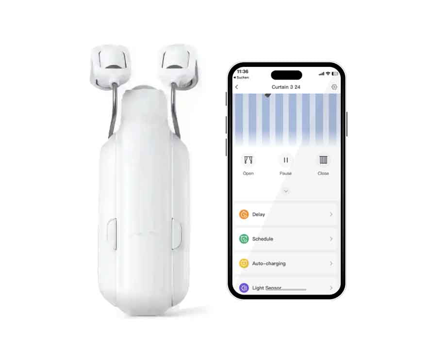 Engineered for rod-type curtains only, the Smart Curtain Robot (Rod Version) fits curtain rods with diameters between 15mm and 40mm. It’s perfectly suited for Ring-Top, Grommet, Tab-Top, and Back Tab curtains, delivering a secure fit and effortless operation. (Not compatible with U-Rail or I-Rail track systems.)